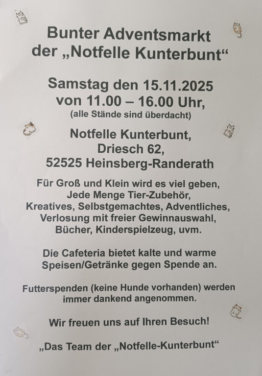 Adventsbasar/Weihnachtsmarkt/Kreativmarkt/Tierzubehörmarkt, Flohmarkt,Verlosung mit freier Gewinn-Auswahl, Cafeteria mit warmen und kalten Angeboten am 15.11.2025 beim Tier-Schutzhof/Gnadenhof "Notfelle Kunterbunt" in 52525 Heinsberg-Randerath, Driesch 62, von 11- 16 Uhr.