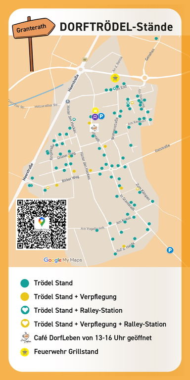 Die Feuerwehr Granterath sorgt für Verpflegung an der Mehrzweckhalle, im Café Dorfleben, an der Kirche, gibt es von 12:00-16:00 Uhr Kaffee und Kuchen.