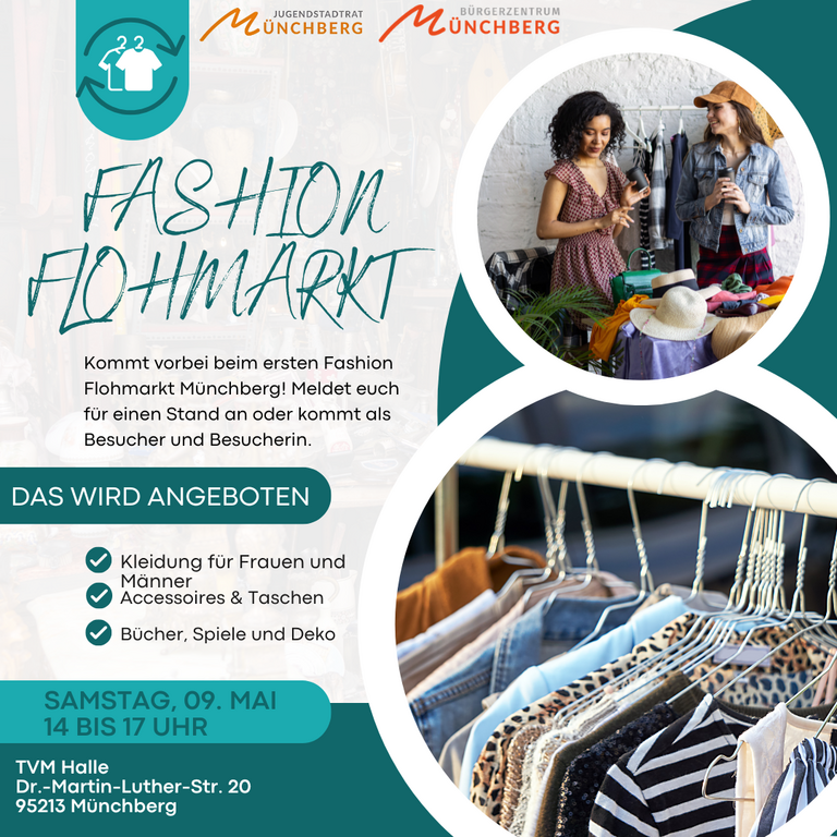 Kommt vorbei beim ersten Fashion Flohmarkt Münchberg! Meldet euch für einen Stand an oder kommt als Besucher und Besucherin.