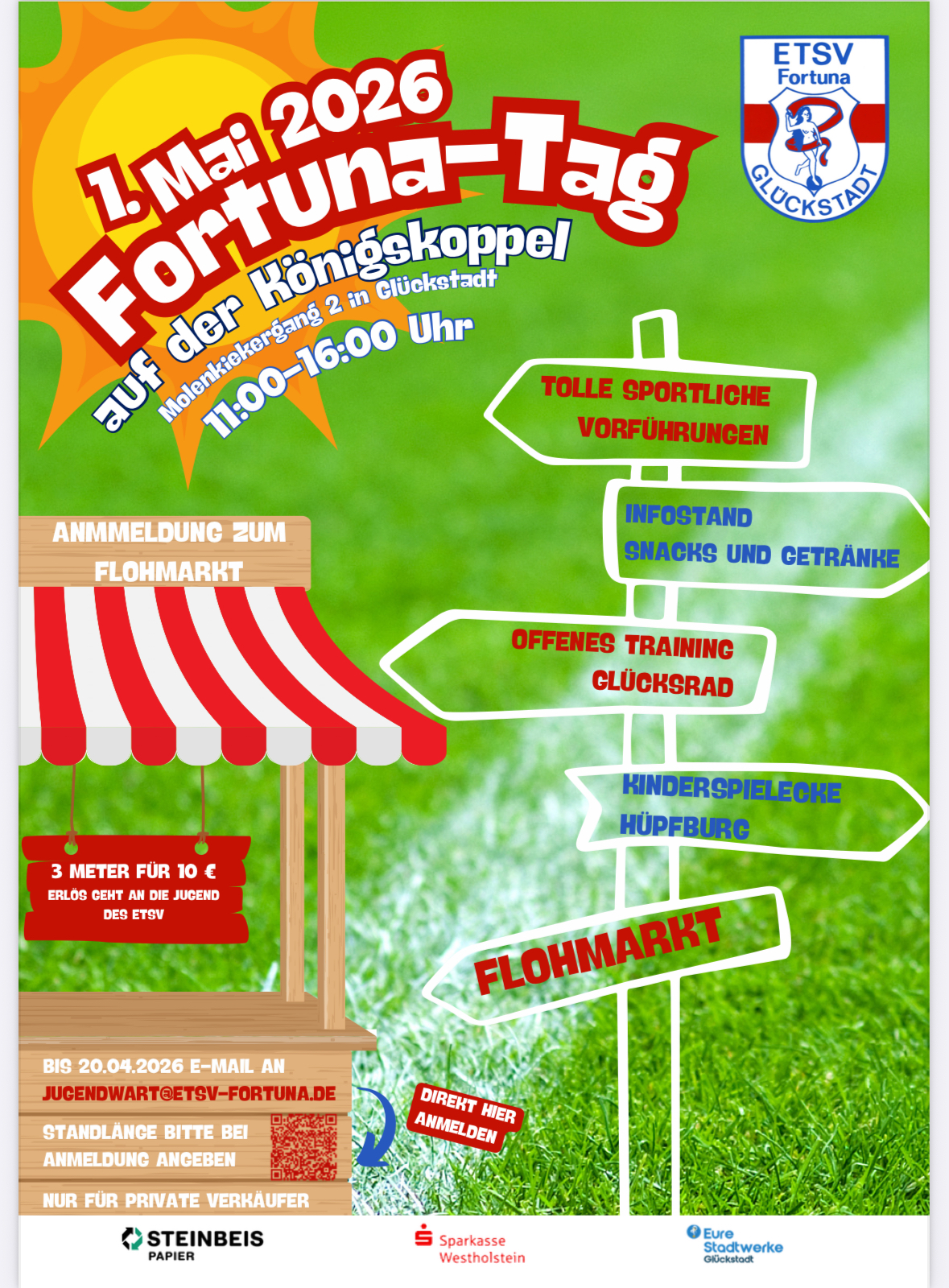 Am 1. Mai von 11:00 Uhr bis 16:00 Uhr ist es wieder Zeit für den Fortunatag. Freut euch auf abwechslungsreiche Flohmarktstände und ein buntes Programm mit vielen Attraktionen auf der Königskoppel.