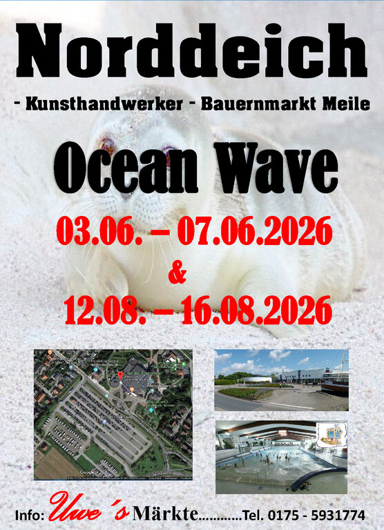 Pünktlich zur Haupt Urlauber Saison organisieren wir den prächtigen Kunsthandwerker- und Bauernmarkt mit maritimer Meile direkt vor dem Ocean Wave in Norddeich, unweit des Strandes. Es gibt zwei aufeinander folgende Termine im Juni und im August. Die Hauptreisezeit ist genau in diesem Zeitraum und ein touristischer Wechsel vorprogrammiert. Die Urlauberzahlen im Herzen von Norddeich sprechen eine eigene Sprache und bewegen sich im sehr hohen 6-stelligen Bereich. Zum wiederholten Mal wird der Dörper Weg, die Hauptstraße entlang des Ocean Wave, eigens für dieses Event gesperrt. Was wünscht sich der Aussteller mehr? Gutes Wetter und alles geht seinen geordneten Weg. Jetzt schon einmal die Termine notieren: 03.06. – 07.06.2026 und 12. – 16.08.2026. Jeweils Mittwoch bis Sonntag. Der Eintritt ist frei. Parkplätze sind ausreichend verfügbar.