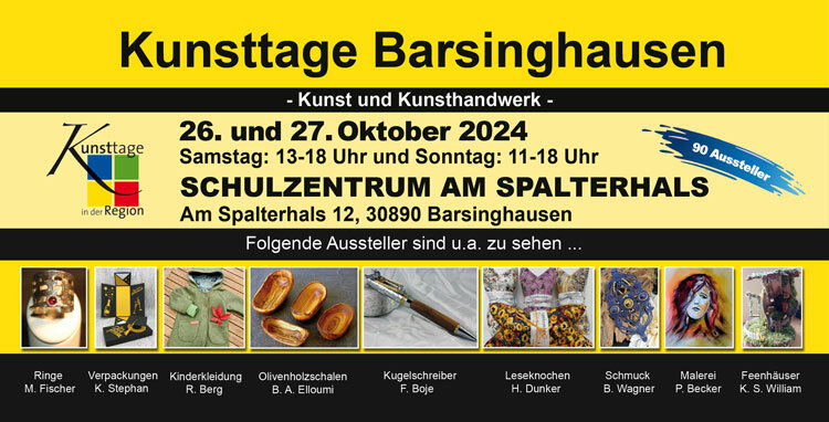 Bei der 18. Auflage der Kunsttage in Barsinghausen präsentieren sich am 25. und 26. Februar wieder mehr als 80 Künstler auf einer der längsten Kunstmeilen in der Region Hannover im Schulzentrum "Am Spalterhals". Erlesenes und traditionelles Kunsthandwerk kombiniert mit trendigem Design machen diesen Markt zu einem Geheimtipp in der Region.