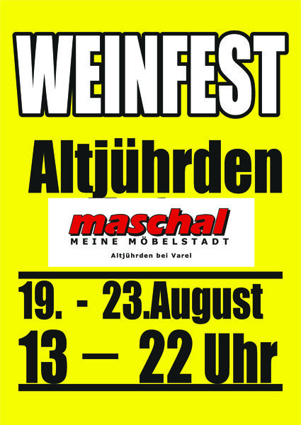 Varel-Altjührden ist eine der besten Lokalitäten für Veranstaltungen, die man sich überhaupt nur vorstellen kann. Das Ortsansässige Möbelhaus bietet auf 40.000 qm Verkaufsfläche alles an Einrichtungsgegenständen, was man sich als Besucher nur vorstellen kann. Seit Jahren organisiert das Möbelhaus selbst, als auch andere Veranstalter immer wieder und gerne auf dem Firmengelände gehobene Veranstaltungen. So gastieren wir selbst seit einigen Jahren zweimal im Jahr mit einem tollen Kunsthandwerker- und Bauernmarkt dort, als auch einmal monatlich einer der größten Trödelmärkte der gesamten Region rings um das gesamt Areal. Diese Trödelmärkte befinden sich mindestens seit 20 Jahren exklusiv dort. Aber, das ist noch nicht Alles. Jahrelang wurden dort sehr große Feste und Partys abgehalten mit Musik Künstlern wie Jürgen Drews, La Bouche, George McCrae, Culture Beat, Middle of the Road, Rednex, Hermes House Band etc. Leider dürfen diese Feste aufgrund der maximal zulässigen Windlasten von Festzelten nach niedersächsischem Recht nicht mehr stattfinden. Jetzt sind wir am Start und werden ein Weinfest par excellence dort veranstalten. Zugelassen werden Winzer, ein normaler Ausschankbetrieb, besondere Gastrostände, sowie einige wenige Kunsthandwerker mit dem Schwerpunktthema passend zum Fest. Unsere Weinfest sind nicht ganz unbekannt, denkt man beispielsweise an Greetsiel im vierten Jahr. Nicht vergessen: Weinfest bei maschal-Möbel in 26326 Varel-Altjührden, direkt vor dem Hauptportal. 5 Tage vom 19. - 23.08.2026. Die Preise für Winzer orientieren sich stets nach deren Platzbedarf und variieren. Der Grundpreis bezieht sich hier auf eine Standfläche von maximal 6,20 x 5,00 mtr.