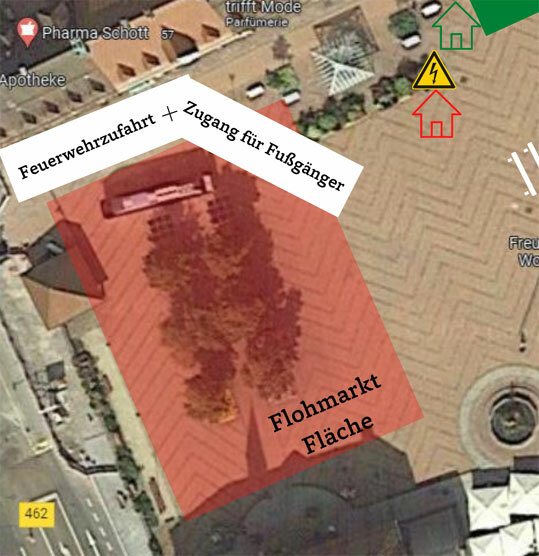 Die /ZufahrtAusfahrt nach Ende des Flohmarktes ist dagegen an der Adler-Apotheke an der Martin-Luther-Strasse.