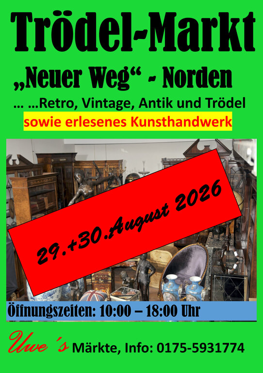 Die vergangenen Sommerfeste in Norden waren bereits riesige Erfolge. Gefeiert wird nicht nur auf dem Marktplatz, sondern auch in der Fußgängerzone, "Neuer Weg" in Richtung Norder Tor. Wir begleiten das Sommerfest an beiden Tagen mit unserem Kunsthandwerkern, sowie einigen Flohmarkt Ständen. Die Stadt Norden hat es sich zur Aufgabe gemacht tolle Straßenkunst, Streetart an bestimmten Hotspots, auch auf dem Marktplatz (quasi an vielen Punkten in der Innenstadt) sowie kulinarische Genüsse zu präsentieren. Der Flohmarkt beginnt ca. auf Höhe des Hotels in Richtung Norder Tor. Wer jetzt denkt dort wäre das Ende der Veranstaltung, liegt falsch, denn am Norder Tor finden weitere Highlights zum Sommerfest 2026 statt. jetzt schon anmelden, denn auch hier gibt es keine unbegrenzten Standflächen. Das Sommerfest 2024 und 2025 war bereit ein riesiger Publikumszulauf.