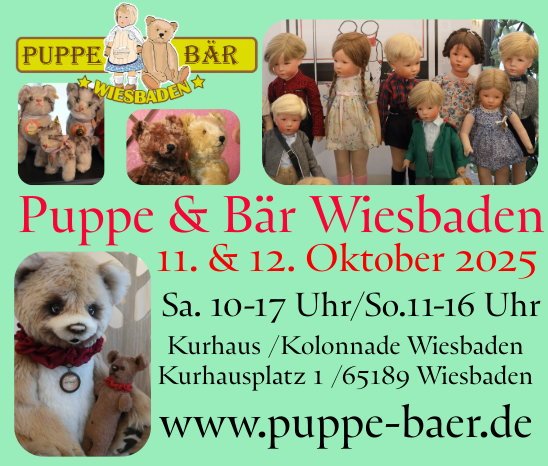 Auf der Puppe & Bär finden Sie, antike deutsche, französische sowie andere Puppen namhafter Hersteller. Antike Puppenkleider, handgenähte Puppenkleider aus antiken Stoffen. Puppenstuben, Puppenstubenzubehör, sowie Miniaturen. Es erwarten Sie hunderte handwerklich genähter Teddybären. Einzigartig in Ihrer Farbe, Form und Gesichtsausdruck. Aber nicht nur Teddy´s sind des Künstlers Leidenschaft auch perfekt in Szene gestellte Tiere, werden ebenso angeboten. Des weiteren gibt es lithogaphierte, gemalte oder gebruschte Bilder rund um den Bären.