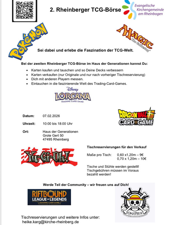 Nach dem Erfolg der beim letzten mal gehts in deie nächste Runde TCG Börse am 07.02.26 und 30.05.26 in Rheinberg. Ein spannender Tag erwartet euch egal ob ihr etwas kaufen wollt oder euch nur austauschen oder auch tauschen oder spielen wollt kommt vorbei.