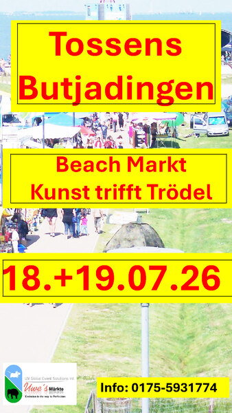 Nach einer langen Pause werden wir ab 2026 wieder aktiv mit einem Beachmarkt am Strand von Tossens /Butjadingen. Vor 15 Jahren hatten wir dort riesige Erfolge. Viele werden sich freuen und auch erinnern. Die Lage ist sehr prägnant, da unmittelbar am Strand gelegen. Viele Besucher kommen auch aus dem örtlichen Centerpark, den vielen Ferienhäusern und Wohnungen, als auch vom angrenzenden Campingplatz. Tossens hat ein riesiges Einzugsgebiet mit Städten wie Nordenham, Bremerhaven, Burhave, Fedderwardersiel, Varel, Brake etc.. Wir werden, wie früher bereits, großflächig werben, obwohl alleine der Jahreszeitpunkt eine große Sicherheit an Besuchern geben wird. Wir haben uns diesmal gezielt die Teilnahme von beiden Produktgruppen auferlegt, da viele Versuche andernorts den Erfolg bestätigt haben. "art meets second hand" an einem der schönsten Nordsee Badeorte der ganzen Region. Don´t miss it: 18. und 19.07.2026, Hauptsaison an den Küsten. 26969 Butjadingen / Tossens , Zufahrt Campingplatz.