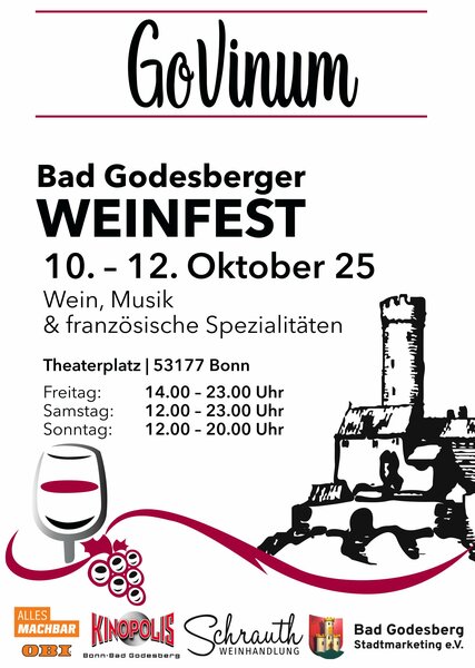 Vom 10. Oktober – 12.Oktober 2025 veranstalten wir zum goldenen Herbst das nächste Weinfest auf dem Theaterplatz in der Bad Godesberger Innenstadt.