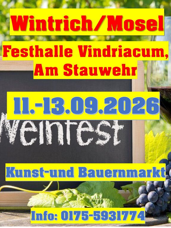 Wintrich, ein malerischer Ort an der Mosel zugehörig zur Samtgemeinde Bernkastel-Kues würde sich freuen unsere Kunsthandwerker kennenlernen zu können. Im Jahr 2025 hatten wir bereits einen großen Erfolg zu verzeichnen, daher folgt jetzt die Fortsetzung. Nutzen wir die einmalige Gelegenheit und unterstützen das Weinfest Wintrich mit einigen unserer schönen Kunsthandwerker- und Bauernmarktständen. Das Weinfest hat auch dort eine lange Tradition und viele nette Besucher. Wintrich liegt direkt an der Mosel und liegt damit besonders attraktiv. Freut euch auf ein weiteres tolles Weinfest an der Mosel im direkten Anschluss an Bernkastel-Kues.